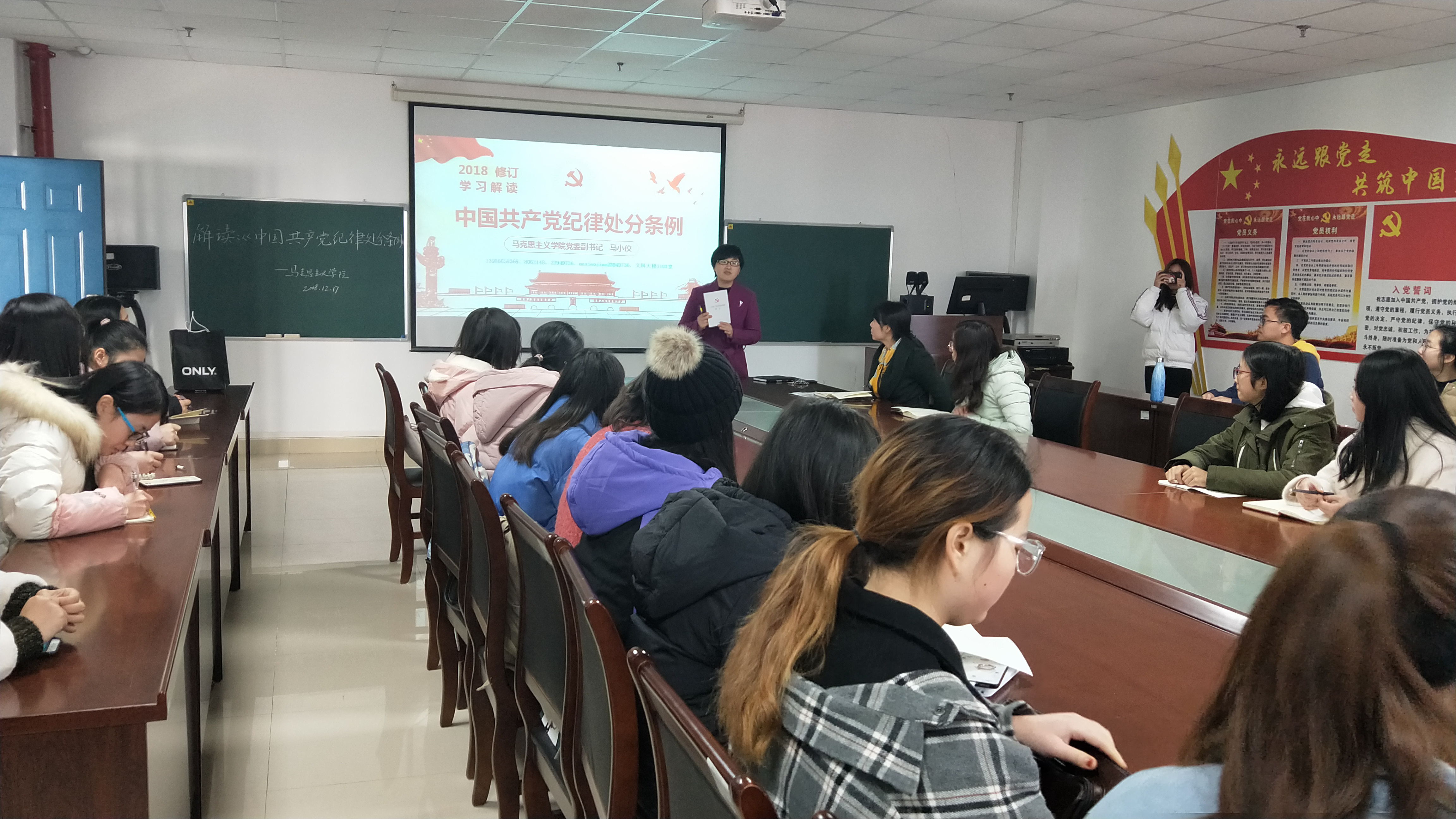 为推动新修订的《中国共产党纪律处分条例》发挥纪律建设标本兼治的利器作用,yl23455永利于2018年12月17日中午12点在文科楼1104会议室召开大会,由公司党委副书记马小佼为本科生全体党员、入党积极分子、员工干部讲了题为《学习解读中国共产党纪律处分条例》的主题党课,引导员工党员、入党积极分子、员工干部认真学习、深刻领会、准确把握《条例》精髓和实质。